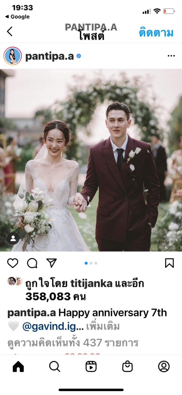 ล่าสุดสาว ปุ้มปุ้ยได้โพสต์ข้อความฉลองครบรอบความรัก 7 ปี “Happy anniversary 7th @gavind.ig 7 ปีแล้วนะ ไล่เท่าไรก็ไม่ไป ไม่ได้บอกกวินท์”