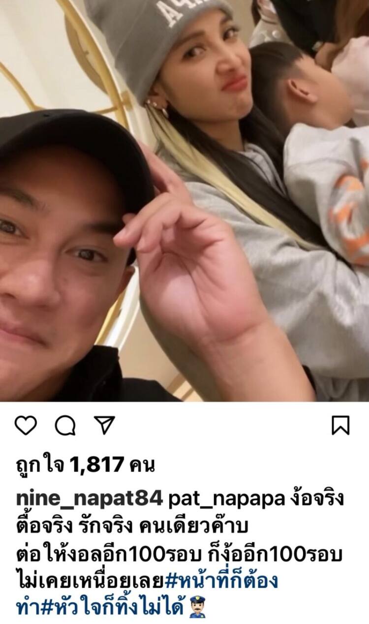 โดยล่าสุดฝ่ายชายก็ได้ออกมาโพสต์แคปชั่นบ้างว่า “pat_napapa ง้อจริง ตื้อจริง รักจริง คนเดียวค๊าบ ต่อให้งอลอีก100รอบ ก็ง้ออีก100รอบไม่เคยเหนื่อยเลย #หน้าที่ก็ต้องทำ #หัวใจก็ทิ้งไม่ได้ “ ท่ามกลางเสียงเชียร์ของเพื่อนพ้องในวงการ และแฟนคลับที่ต่างก็เอาใจช่วยให้ทั้งคู่สมหวังกับความรักครั้งนี้