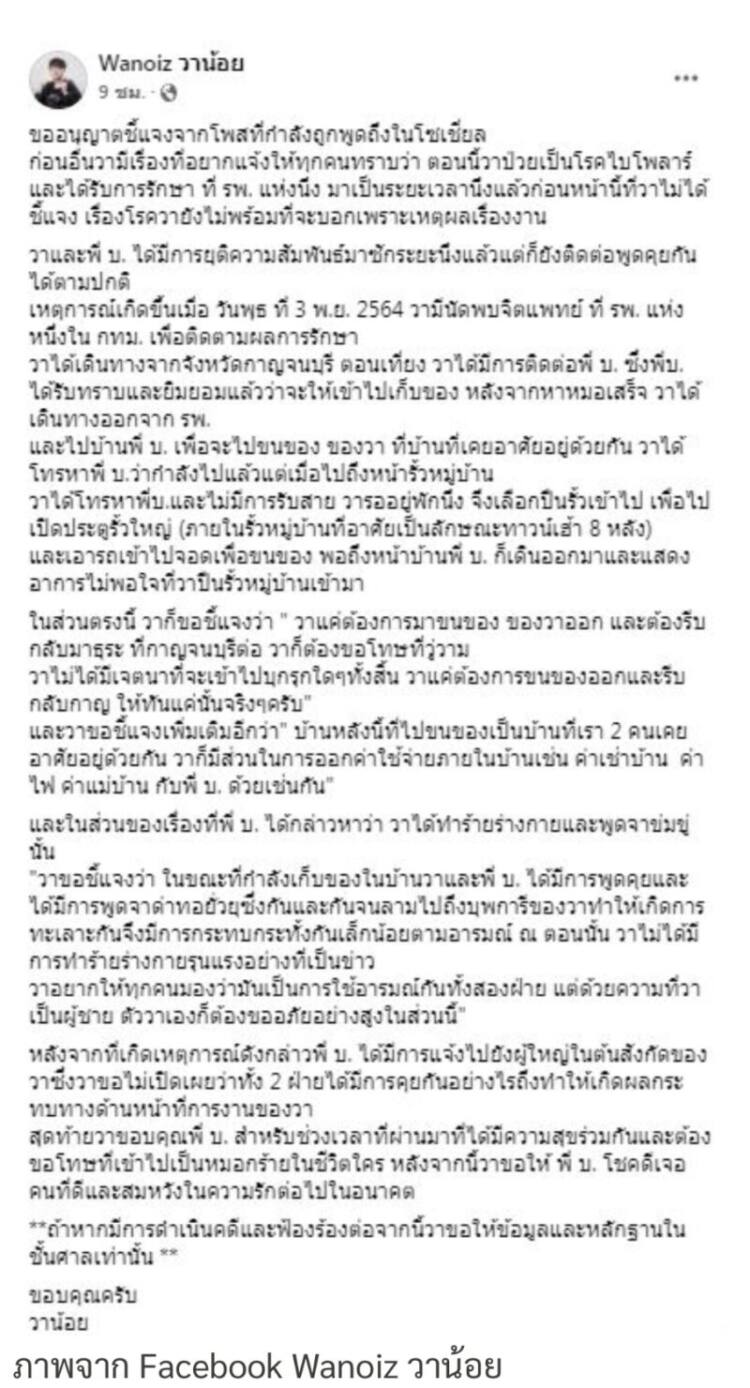 สุดท้ายวาขอบคุณพี่ บ. สำหรับช่วงเวลาที่ผ่านมาที่ได้มีความสุขร่วมกันและต้องขอโทษที่เข้าไปเป็นหมอกร้ายในชีวิตใคร หลังจากนี้วาขอให้ พี่ บ. โชคดีเจอคนที่ดีและสมหวังในความรักต่อไปในอนาคต ถ้าหากมีการดำเนินคดีและฟ้องร้องต่อจากนี้วาขอให้ข้อมูลและหลักฐานในชั้นศาลเท่านั้น ขอบคุณครับ วาน้อย”