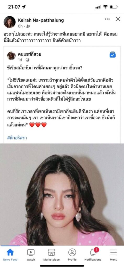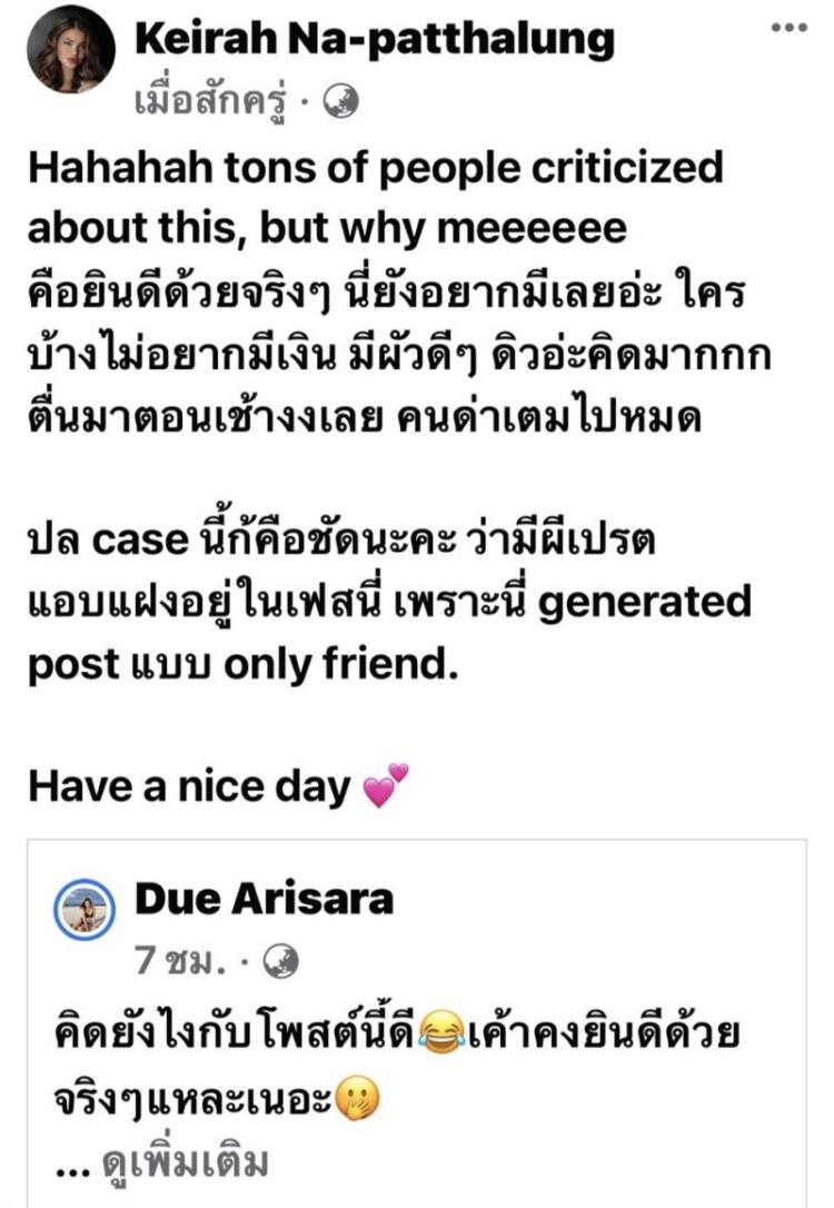 “คือยินดีด้วยจริงๆ นี่ยังอยากมีเลยอ่ะ ใครบ้างไม่อยากมีเงิน มีผัวดีๆ ดิวอ่ะคิดมากกก ไม่ต้องให้คนอื่นคิดแทนก้ได้ โพสต์ขนาดนี้ คิดเองเลยยย 555 ตื่นมาตอนเช้างงเลย คนด่าเตมไปหมด