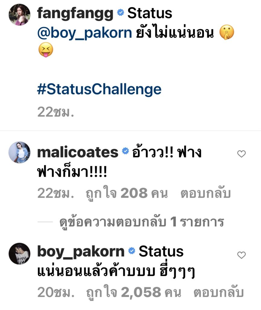 ซึ่งหนุ่มบอยก็รีบเข้ามาคอมเมนต์ตอบทันทีว่า “Status แน่นอนแล้วค้าบบบ ฮี่ๆๆๆ” เอาละสิแบบนี้แฟนคลับมีลุ้น แน่นอน