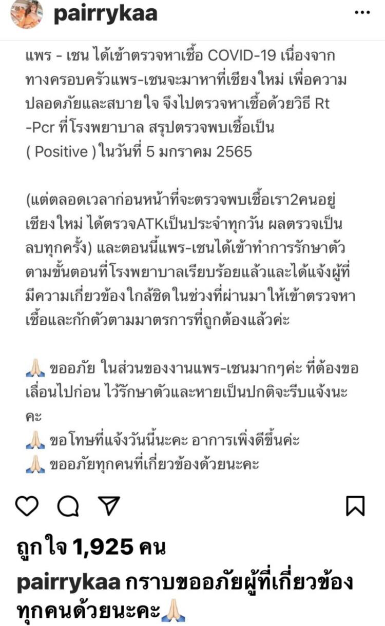 uและตอนนี้แพร-เชนได้เข้าทำการรักษาตัวตามขั้นตอนที่โรงพยาบาลเรียบร้อยแล้วและได้แจ้งผู้ที่มีความเกี่ยวข้องใกล้ชิดในช่วงที่ผ่านมาให้เข้าตรวจหาเชื้อและกักตัวตามมาตรการที่ถูกต้องแล้วค่ะ ขออภัย ในส่วนของงานแพร-เชนมากๆค่ะ ที่ต้องขอเลื่อนไปก่อน ไว้รักษาตัวและหายเป็นปกติจะรีบแจ้งนะคะขอโทษที่แจ้งวันนี้นะคะ อาการเพิ่งดีขึ้นค่ะขออภัยทุกคนที่เกี่ยวข้องด้วยนะคะ”