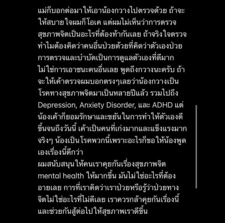 แต่ผมไม่เห็นว่าการตรวจสุขภาพจิตเป็นอะไรที่ต้องท้ากันเลย ถ้าจริงใจตรวจทำไมต้องคิดว่าคนอื่นป่วยด้วย ที่คิดว่าตัวเองป่วยการตรวจและบำบัดเป็นการดูแลตัวเองที่ดีมาก ไม่ใช่การเอาชนะคนอื่นเลย พูดถึงกวางนะครับ ถ้าจะให้เขาตรวจ ผมบอกตรงๆ เลยว่าน้องกวางเป็นโรคทางสุขภาพจิตมาเป็นหลายปีแล้ว รวมไปถึง depression ,anxiety disorder และ adhd แต่น้องก็ยอมรักษาและขยันในการทำให้ตัวเองดีขึ้นจนถึงวันนี้ เขาเป็นคนที่เก่งมากและแข็งแรกมาก จริง ๆ น้องเป็นโรคพวกนี้เพราะอะไรก็ขอให้น้องพูดเองเรื่องนี้ดีกว่า