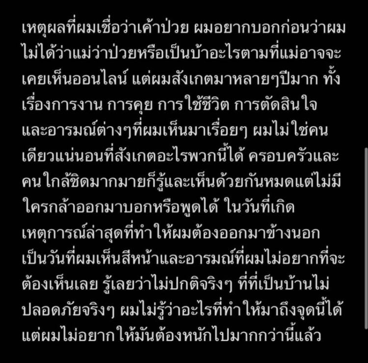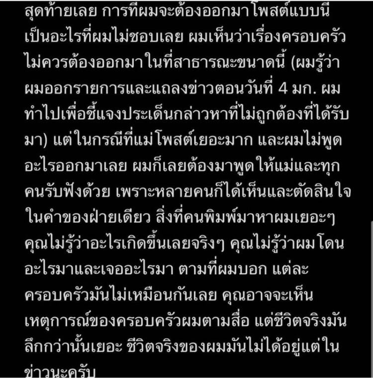 สุดท้ายเลย การที่ผมจะต้องออกมาโพสต์แบบนี้เป็นอะไรที่ผมไม่ชอบเลย ผมเห็นว่าเรื่องครอบครัวไม่ควรต้องออกมาในที่สาธารณะขนาดนี้ (ผมรู้ว่าผมออกรายการและแถลงข่าวตอนวันที่ 4 ม.ค ผมทำไปเพื่อชี้แจงประเด็นกล่าวหาที่ไม่ถูกต้องที่ได้รับมา) แต่ในกรณีที่แม่โพสต์เยอะมาก และผมไม่พูดอะไรออกมาเลย ผมก็เลยต้องมาพูดให้แม่และทุกคนรับฟังด้วย เพราะหลายคนก็ได้เห็นและตัดสินใจในคำของฝ่ายเดียว สิ่งที่คนพิมพ์มาหาผมเยอะๆ คุณไม่รู้ว่าอะไรเกิดขึ้นเลยจริง ๆ คุณไม่รู้ว่าผมโดนอะไรมาและเจออะไรมา ตามที่ผมบอก แต่ละครอบครัวมันไม่เหมือนกันเลย คุณอาจจะเห็นเหตุการณ์ของครอบครัวผมตามสื่อ แต่ชีวิตจริงมันลึกกว่านั้นเยอะ ชีวิตจริงของผมมันไม่ได้อยู่แต่ในข่าวนะครับ