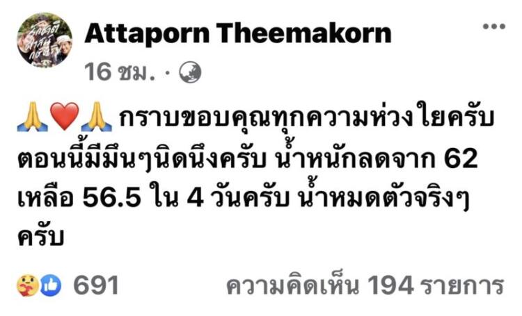 จากนั้นหนุ่มก็โพสต์ต่ออีกว่า “ กราบขอบคุณทุกความห่วงใยครับตอนนี้มีมึนๆนิดนึงครับ น้ำหนักลดจาก 62 เหลือ 56.5 ใน 4 วันครับ น้ำหมดตัวจริงๆครับ”
