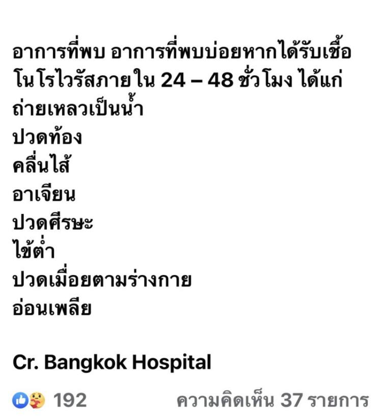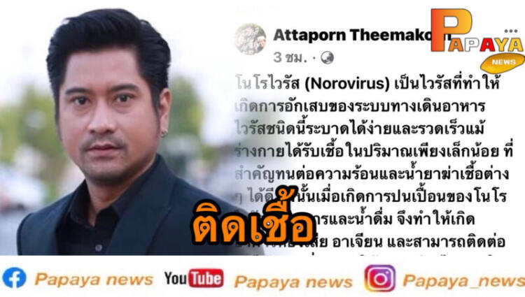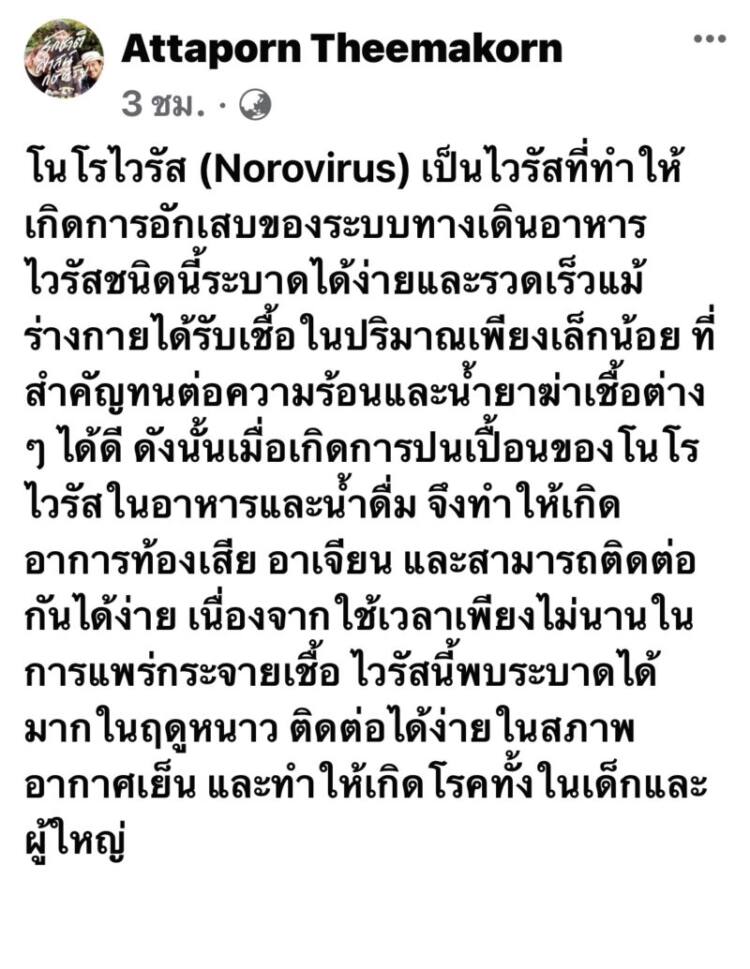 ล่าสุดเจ้าตัวได้โพสต์อัพเดทว่าที่ตนเองมีอาการอาหารเป็นพิษนั้นเนื่องจากได้รับเชื้อโรคที่กำลังระบาดอยู่ในขณะนี้ “โนโรไวรัส(Norovirus) เป็นไวรัสที่ทำให้เกิดการอักเสบของระบบทางเดินอาหาร ไวรัสชนิดนี้ระบาดได้ง่ายและรวดเร็วแม้ร่างกายได้รับเชื้อในปริมาณเพียงเล็กน้อย ที่สำคัญทนต่อความร้อนและน้ำยาฆ่าเชื้อต่าง ๆ ได้ดี ดังนั้นเมื่อเกิดการปนเปื้อนของโนโรไวรัสในอาหารและน้ำดื่ม จึงทำให้เกิดอาการท้องเสีย อาเจียน และสามารถติดต่อกันได้ง่าย เนื่องจากใช้เวลาเพียงไม่นานในการแพร่กระจายเชื้อ ไวรัสนี้พบระบาดได้มากในฤดูหนาว ติดต่อได้ง่ายในสภาพอากาศเย็น และทำให้เกิดโรคทั้งในเด็กและผู้ใหญ่