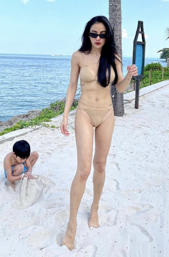 แต่กลับเจิดจ้ากว่าแสงแดดชายทะเล ด้วยชุดบิกินี่สีเนื้อตัวจิ๋ว อวดชัดๆ ทุกสัดส่วน พร้อมแคปชั่นยอดฮิต “สวัสดีคะเหยื่อ…เสือกลับมาแล้ว #หาเหยื่อแปป”