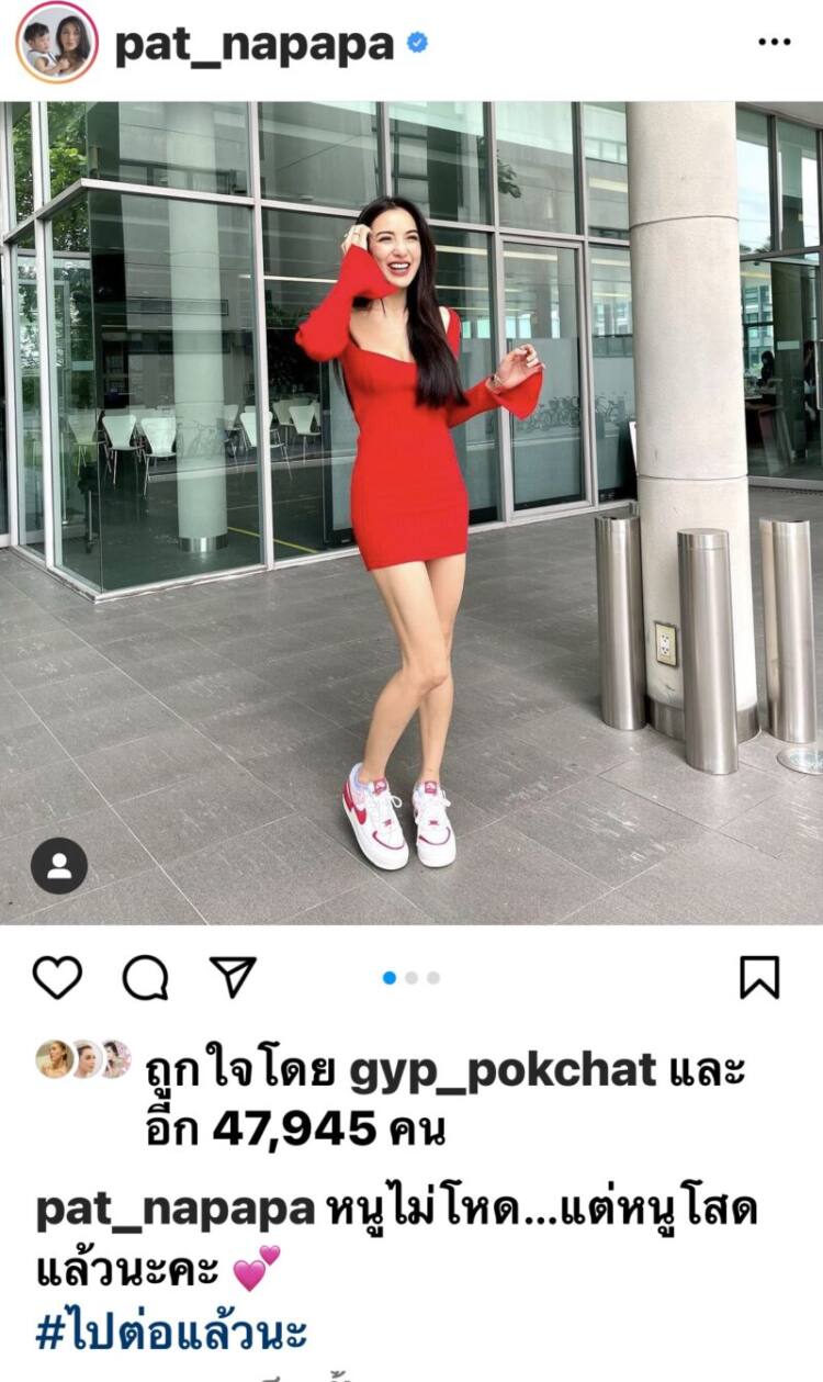 ส่วนคุณแม่สุดสตรองอย่างสาวแพทก็โพสต์รูปตนเองใส่ชุดเดรสสั้นสีแดงสดใสกับข้อความว่า “หนูไม่โหด…แต่หนูโสดแล้วนะคะ”