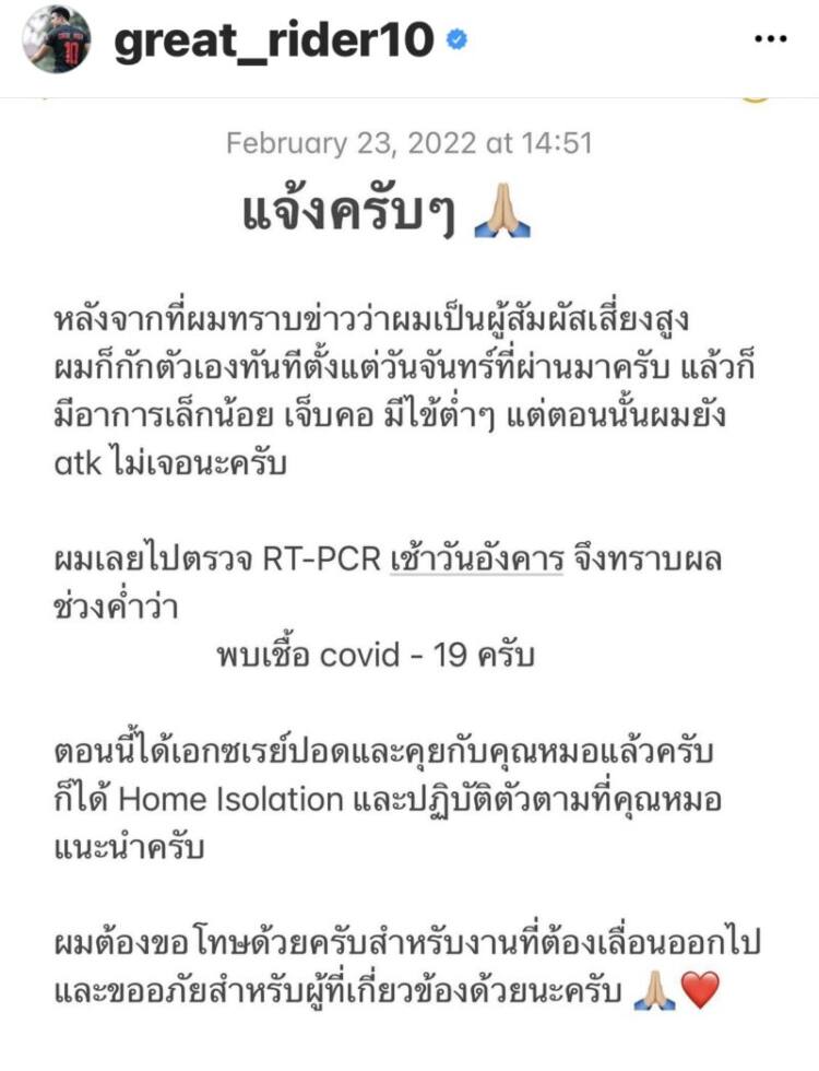 แต่ตอนนั้นผมยัง atk ไม่เจอนะครับ ผมเลยไปตรวจ RT-PCR เช้าวันอังคาร จึงทราบผลช่วงค่ำว่า พบเชื้อ covid – 19 ครับ ตอนนี้ได้เอ็กซเรย์ปอดและคุยกับคุณหมอแล้วครับ ก็ได้ Home Isolation และปฏิบัติตัวตามที่คุณหมอ แนะนำครับผมต้องขอโทษด้วยครับสำหรับงานที่ต้องเลื่อนออกไป”