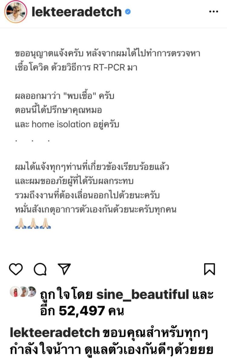 ทางด้าน “อาเล็ก ธีรเดช เมธาวรายุทธ” ก็ได้ออกมาโพสต์แจ้งข่าวเช่นกันว่า ตนเองนั้นติดโควิด-19 หลังจากใกล้ชิดผู้ป่วย ซึ่งจากผลตรวจ RT-PCR พบว่าติดเชื้อ ตอนนี้กำลังปรึกษาคุณหมอเพื่อเข้าระบบ Home Isolation และได้ขออภัยไปยังผู้ที่ใกล้ชิดด้วย โดยเจ้าตัวได้โพสต์ผ่านอินสตาแกรมว่า