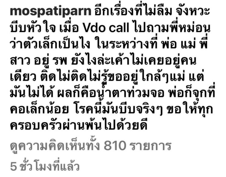“อีกเรื่องที่ไม่ลืม จังหวะบีบหัวใจ เมื่อ Vdo call ไปถามพี่หม่อนว่าตัวเล็กเป็นไง ในระหว่างที่ พ่อ แม่ พี่สาว อยู่ รพ ยังไงล่ะเค้าไม่เคยอยู่คนเดียว ติดไม่ติดไม่รู้ขออยู่ใกล้ๆแม่ แต่มันไม่ได้ ผลก็คือน้ำตาท่วมจอ พ่อก็จุกที่คอเล็กน้อย โรคนี้มันบีบจริงๆ ขอให้ทุกครอบครัวผ่านพ้นไปด้วยดี”