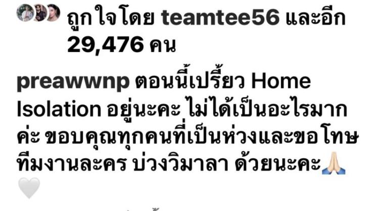 โดยใช้แคปชั่นว่า “ตอนนี้เปรี้ยว Home Isolation อยู่นะคะ ไม่ได้เป็นอะไรมากค่ะ ขอบคุณทุกคนที่เป็นห่วงและขอโทษทีมงานละคร บ่วงวิมาลา ด้วยนะคะ”