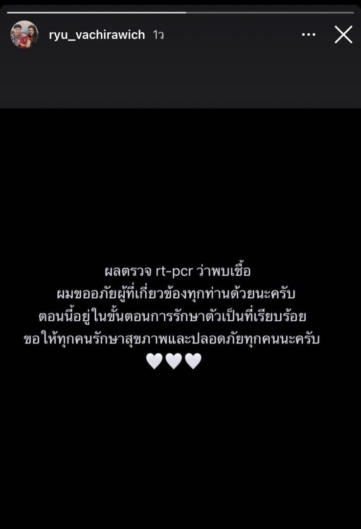 “ผลตรวจ rt-pcr ว่าพบเชื้อ ผมขออภัยผู้ที่เกี่ยวข้องทุกท่านด้วยนะครับ ตอนนี้อยู่ในขั้นตอนการรักษาตัวเป็นที่เรียบร้อย ขอให้ทุกคนรักษาสุขภาพและปลอดภัยทุกคนนะครับ”