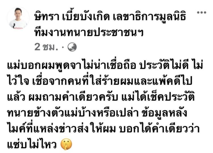 ทางด้าน “ทนายตั้ม ษิทรา เบี้ยบังเกิด” ที่ถูกแม่แตงโมห้ามมาเกี่ยวข้องกับคดีก็ได้โพสต์เฟซบุ๊กส่วนตัวว่า “แม่บอกผมพูดจาไม่น่าเชื่อถือ ประวัติไม่ดี ไม่ไว้ใจ เชื่อจากคนที่ใส่ร้ายผมและแพ้คดีไปแล้ว ผมถามคำเดียวครับ แม่ได้เช็คประวัติทนายข้างตัวแม่บ้างหรือเปล่า ข้อมูลหลังไมค์ที่แหล่งข่าวส่งให้ผม บอกได้คำเดียวแซ่บไม่ไหว”