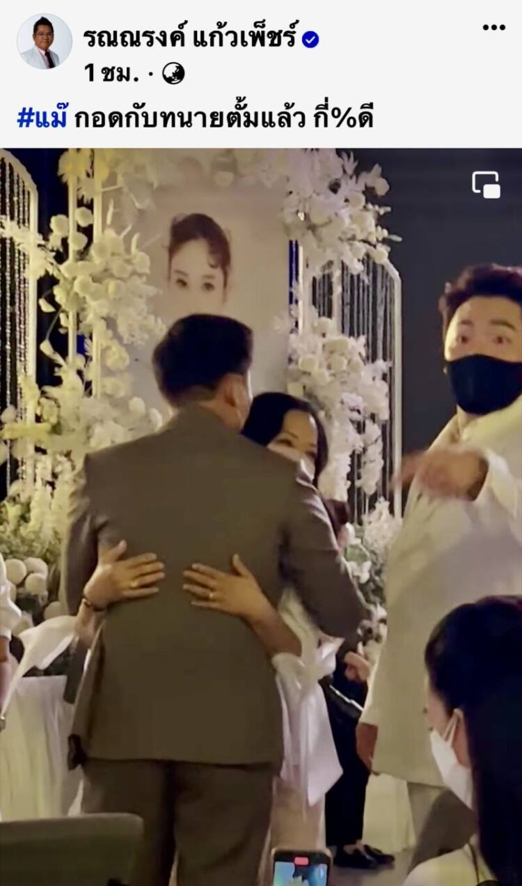 ซึ่ง “ทนายรณณรงค์ แก้วเพ็ชร์” ก็ได้โพสต์คลิปตอนคุณแม่ภนิดากอดกับทนายตั้มว่า “#แม๊ กอดกับทนายตั้มแล้ว กี่%ดี”