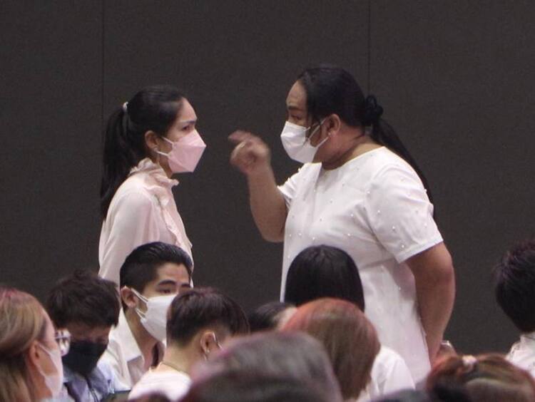 แต่ในระหว่างรอพิธีไว้อาลัยมีช่วงหนึ่งที่ “เต้ ภาราดา จินดารัตน์” ช่างแต่งหน้าและเป็นผู้จัดการ “พิ้งกี้ สาวิกา” ได้เข้าไปพูดคุยกับ “กระติก อิจศรินทร์ จุฑาสุขสวัสดิ์” และมีการใช้นิ้วจิ้มไปที่หน้าผากของกระติก ระหว่างรอพิธีไว้อาลัยแตงโม ด้านในคริสตจักรเสรีภาพกรุงเทพ ก่อนที่ต่างฝ่ายต่างแยกย้ายกันไป