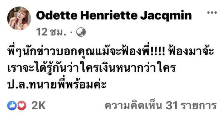 ก่อนที่อดีตนางแบบสุดแซ่บจะโพสต์ข้อความอีกว่า “พี่ๆนักข่าวบอกคุณแม๊จะฟ้องพี่!!!! ฟ้องมาจ๊ะ เราจะได้รู้กันว่า ใครเงินหนากว่าใคร ป.ล.ทนายพี่พร้อมค่ะ”