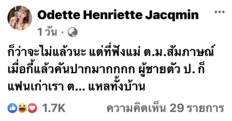 หลังจากที่ แม่แตงโม ได้ให้สัมภาษณ์เสร็จแล้วนั้น ทางด้านอดีตนางแบบสาวชื่อดัง“โอเด็ต เฮนเรียต แจ็คโคมิน” ซึ่งไปใช้ชีวิตคู่อยู่กับสามีที่ต่างประเทศ ก็ได้ออกมาโพสต์เฟซบุ๊กถึงแม่แตงโม รวมถึงผู้ชายอักษร ป. ว่า “ก็ว่าจะไม่แล้วนะ แต่ที่ฟังแม่ ต.ม.สัมภาษณ์เมื่อกี้แล้ว คันปากมากกกก ผู้ชายตัว ป. ก็แฟนเก่าเรา ต…แหลทั้งบ้าน”