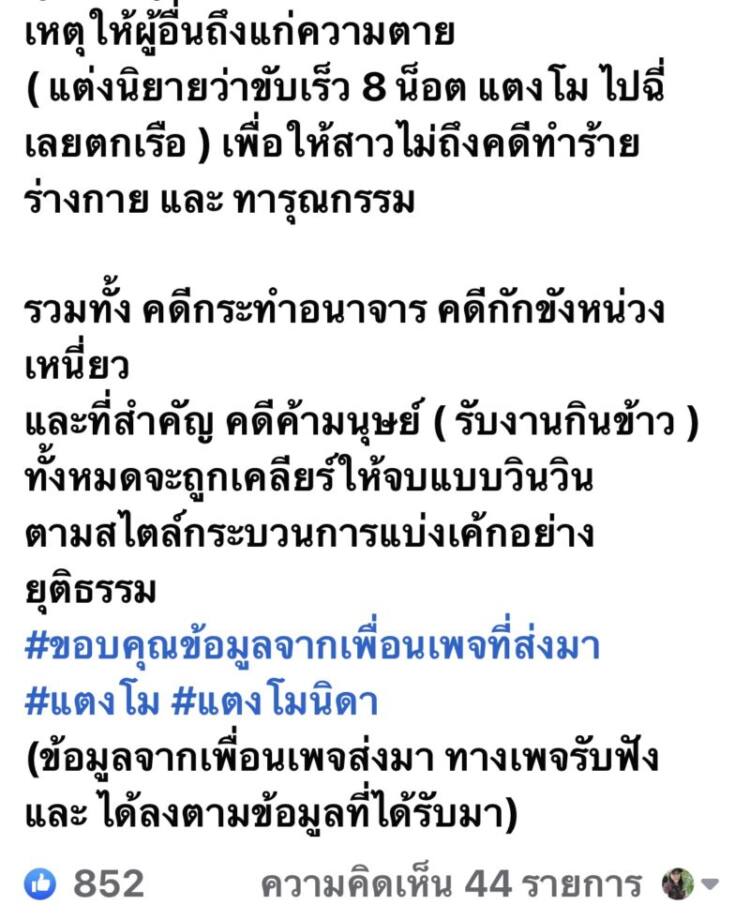 ( แต่งนิยายว่าขับเร็ว 8 น็อต แตงโม ไปฉี่เลยตกเรือ ) เพื่อให้สาวไม่ถึงคดีทำร้ายร่างกาย และ ทารุณกรรม
