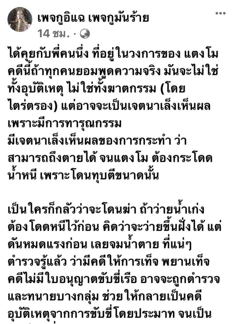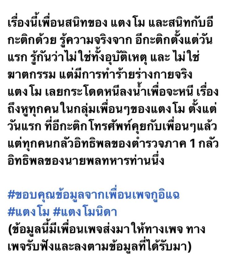 และ ไม่ใช่ฆาตกรรม แต่มีการทำร้ายร่างกายจริง แตงโม เลยกระโดดหนีลงน้ำเพื่อจะหนี เรื่องถึงหูทุกคนในกลุ่มเพื่อนๆของแตงโม ตั้งแต่วันแรก ที่อีกะติกโทรศัพท์คุยกับเพื่อนๆแล้ว แต่ทุกคนกลัวอิทธิพลของตำรวจภาค 1 กลัวอิทธิพลของนายพลทหารท่านนึ่ง (ข้อมูลนี้มีเพื่อนเพจส่งมาให้ทางเพจ ทางเพจรับฟังและลงตามข้อมูลที่ได้รับมา”