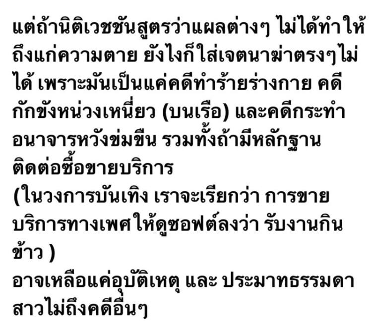 คดีนี้ถ้าทุกคนยอมพูดความจริง มันจะไม่ใช่ทั้งอุบัติเหตุ ไม่ใช่ทั้งฆาตกรรม (โดยไตร่ตรอง) แต่อาจจะเป็นเจตนาเล็งเห็นผล เพราะมีการทารุณกรรม