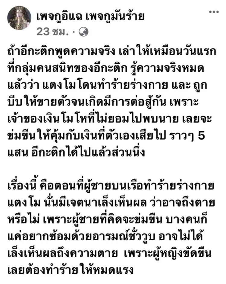 เพราะเจ้าของเงินโมโหที่ไม่ยอมไปพบนาย เลยจะข่มขืนให้คุ้มกับเงินที่ตัวเองเสียไป ราวๆ 5 แสน อีกะติกได้ไปแล้วส่วนนึ่งเรื่องนี้ คือตอนที่ผู้ชายบนเรือทำร้ายร่างกาย แตงโม นั่นมีเจตนาเล็งเห็นผล ว่าอาจถึงตายหรือไม่ เพราะผู้ชายที่คิดจะขืนใจ บางคนก็แค่อยากซ้อมด้วยอารมณ์ชั่ววูบ