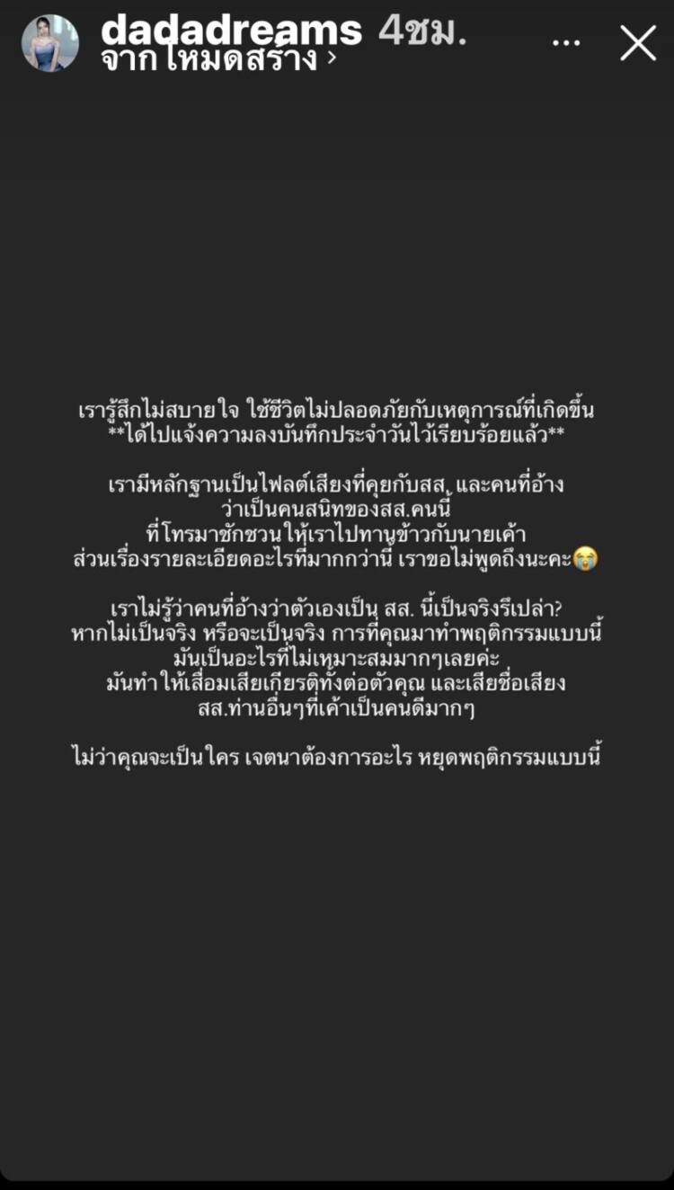 เรารู้สึกไม่สบายใจ ใช้ชีวิตไม่ปลอดภัยกับเหตุการณ์ที่เกิดขึ้น ได้ไปแจ้งความลงบันทึกประจำวันไว้เรียบร้อยแล้ว เรามีหลักฐานเป็นไฟล์เสียงที่คุยกับ ส.ส. และคนที่อ้างว่าเป็นคนสนิทของ ส.ส. คนนี้ ที่โทรมาชักชวนให้เราไปทานข้าวกับนายเขา