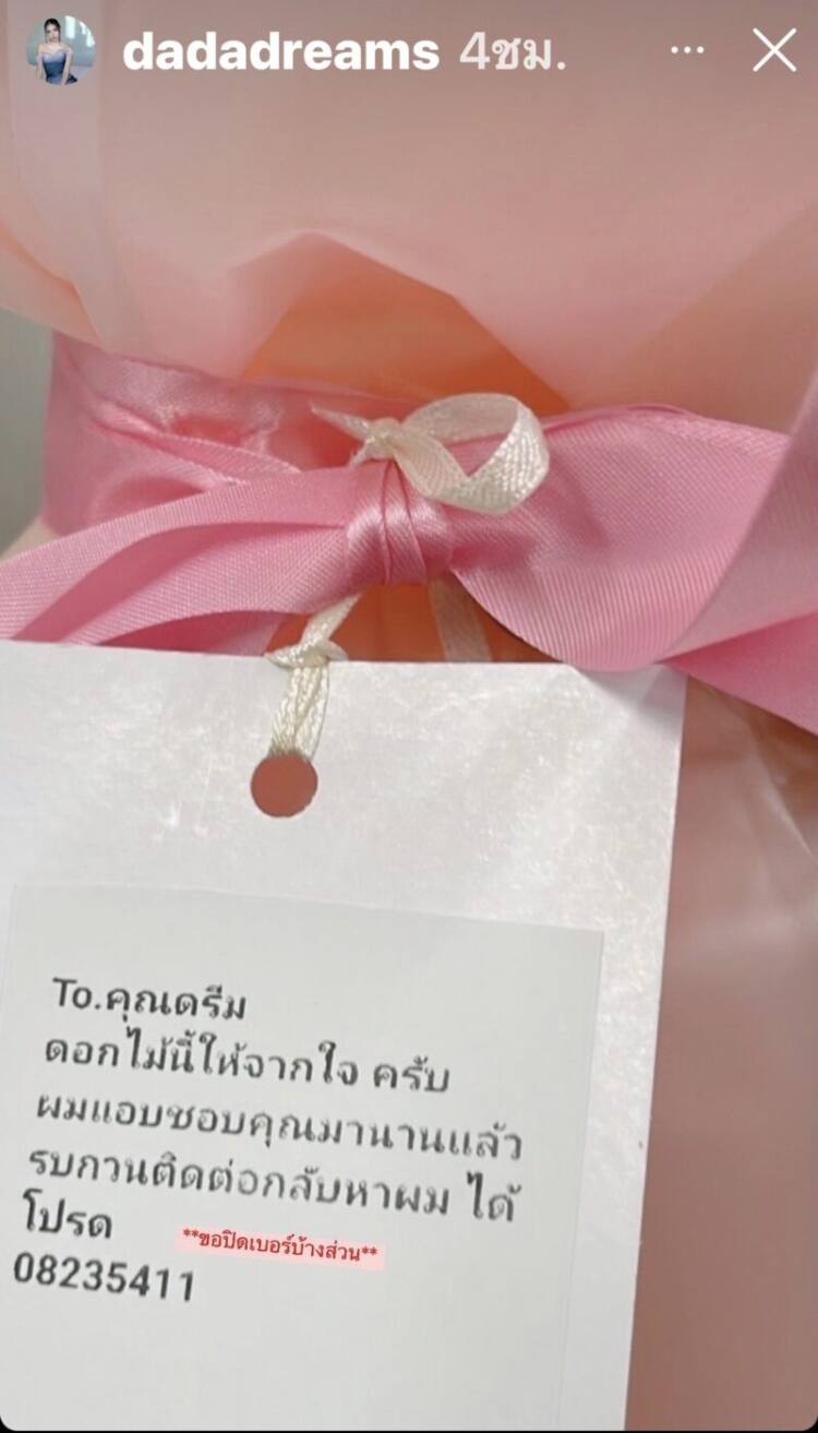 ซึ่งดรีมได้โพสต์ภาพช่อดอกไม้ที่ GRAB เอามาส่งให้เธอในช่วงเวลาประมาณ 5 ทุ่ม และในช่อดอกไม้ดังกล่าว มีการ์ดที่เขียนข้อความไว้ว่า “ถึงคุณดรีม ดอกไม้นี้ให้จากใจครับ ผมแอบชอบคุณมานานแล้ว รบกวนติดต่อกลับหาผม ได้โปรด”