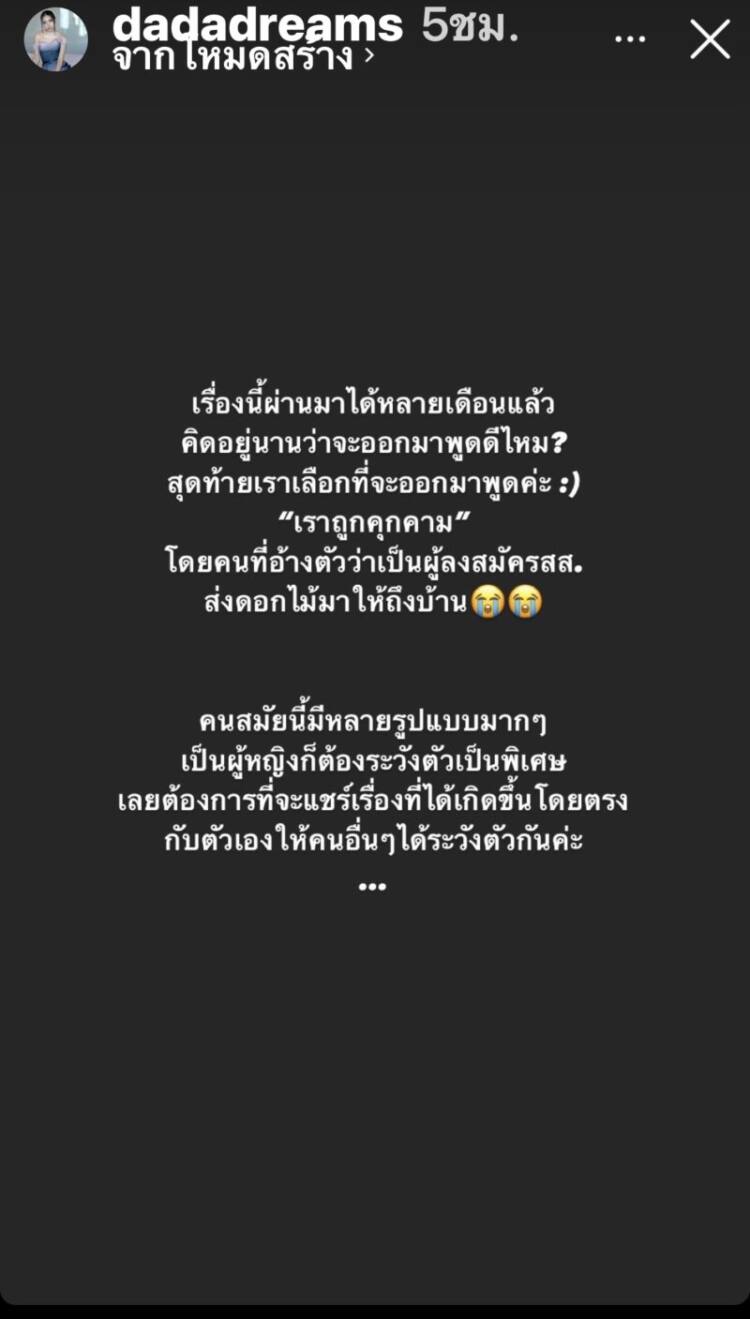“เรื่องนี้ผ่านมาได้หลายเดือนแล้ว คิดอยู่นานว่าออกมาพูดดีไหม? สุดท้ายเราเลือกที่จะออกมาพูดค่ะ “เราถูกคุกคาม” โดยคนที่อ้างตัวว่าเป็นผู้ลงสมัคร ส.ส. ส่งดอกไม้มาให้ถึงบ้าน คนสมัยนี้มีหลายรูปแบบมากๆ เป็นผู้หญิงก็ต้องระวังตัวเป็นพิเศษ เลยต้องการที่จะแชร์เรื่องที่เกิดขึ้นโดยตรง กับตัวเองให้คนอื่นๆได้ระวังตัวกันค่ะ”