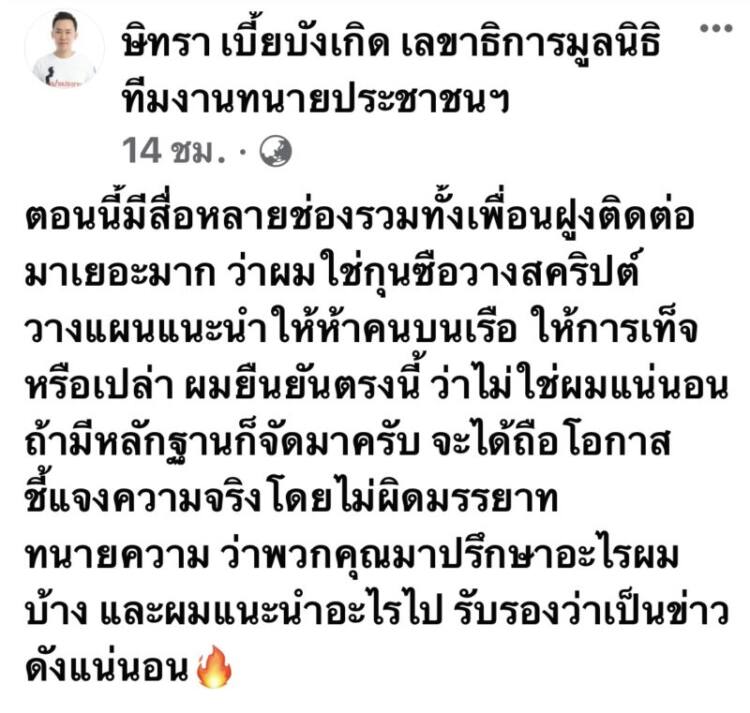ซึ่ง “ทนายตั้ม ษิทรา เบี้ยบังเกิด” เลขาธิการมูลนิธิทีมงานทนายประชาชนฯ ก็ได้โพสต์เฟซบุ๊กชี้แจงว่า “ตอนนี้มีสื่อหลายช่องรวมทั้งเพื่อนฝูงติดต่อมาเยอะมาก ว่าผมใช่กุนซือวางสคริปต์ วางแผนแนะนำให้ห้าคนบนเรือ ให้การเท็จหรือเปล่า ผมยืนยันตรงนี้ว่าไม่ใช่ผมแน่นอน ถ้ามีหลักฐานก็จัดมาครับ จะได้ถือโอกาสชี้แจงความจริง โดยไม่ผิดมรรยาททนายความ ว่าพวกคุณมาปรึกษาอะไรผมบ้าง และผมแนะนำอะไรไป รับรองว่าเป็นข่าวดังแน่นอน”