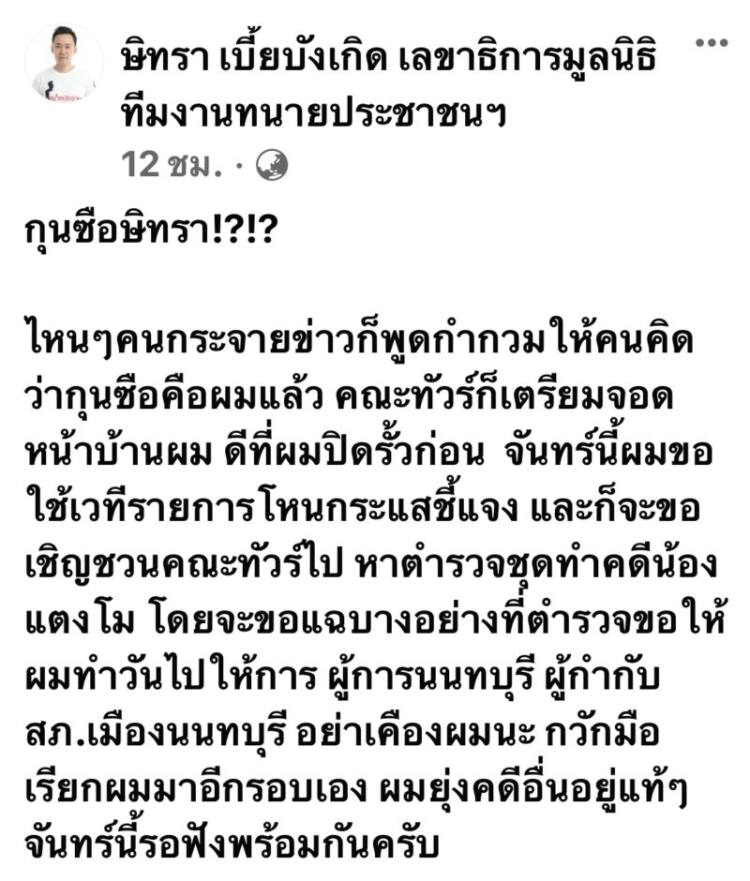 ก่อนที่ ทนายตั้ม จะโพสต์อีกว่า “กุนซือษิทรา!?!? ไหนๆ คนกระจายข่าวก็พูดกำกวมให้คนคิดว่ากุนซือคือผมแล้ว คณะทัวร์ก็เตรียมจอดหน้าบ้านผม ดีที่ผมปิดรั้วก่อน จันทร์นี้ผมขอใช้เวทีรายการโหนกระแสชี้แจง และจะขอเชิญชวนคณะทัวร์ไปหาตำรวจชุดทำคดีน้องแตงโม โดยจะขอแฉบางอย่างที่ตำรวจขอให้ผมทำวันไปให้การ ผู้การนนทบุรี ผกก.สภ.เมืองนนทบุรี อย่าเคืองผมนะ กวักมือเรียกผมมาอีกรอบเอง ผมยุ่งคดีอื่นอยู่แท้ๆ จันทร์นี้รอฟังพร้อมกันครับ”