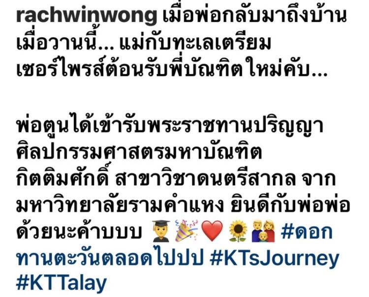 พ่อตูนได้เข้ารับพระราชทานปริญญาศิลปกรรมศาสตรมหาบัณฑิตกิตติมศักดิ์ สาขาวิชาดนตรีสากล จากมหาวิทยาลัยรามคำแหง ยินดีกับพ่อพ่อด้วยนะค้าบบบ #ดอกทานตะวันตลอดไปปป #KTsJourney #KTTalay”