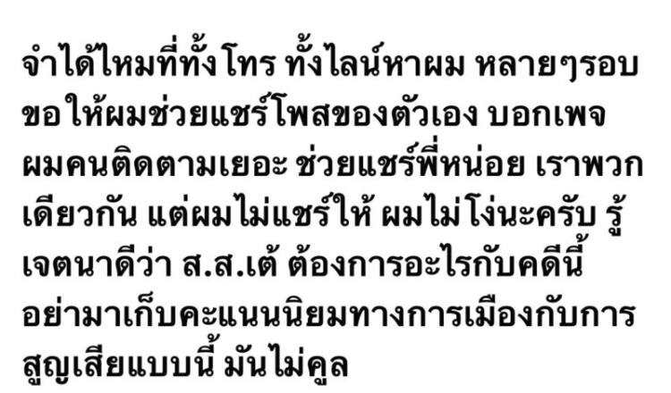 จำได้ไหมที่ทั้งโทร ทั้งไลน์หาผม หลายๆรอบ ขอให้ผมช่วยแชร์โพสของตัวเอง บอกเพจผมคนติดตามเยอะ ช่วยแชร์พี่หน่อย เราพวกเดียวกัน แต่ผมไม่แชร์ให้ ผมไม่โง่นะครับ รู้เจตนาดีว่า ส.ส.เต้ ต้องการอะไรกับคดีนี้ อย่ามาเก็บคะแนนนิยมทางการเมืองกับการสูญเสียแบบนี้ มันไม่คูล จากนั้นทนายตั้มได้โพสต์ฟาดรัวๆต่อในช่องคอมเมนต์