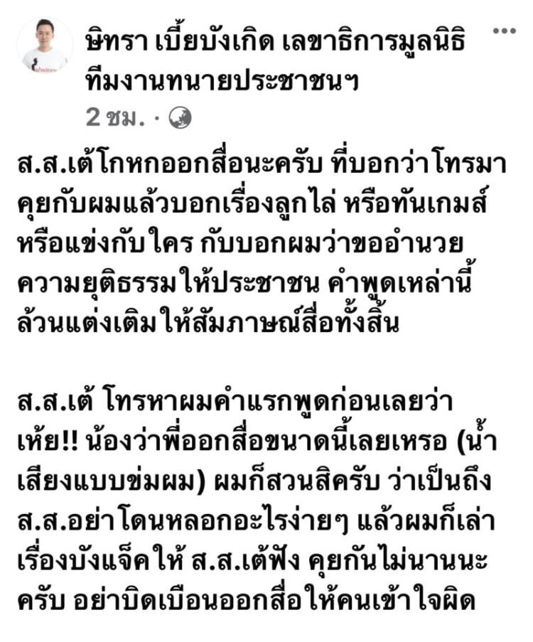 ส.ส.เต้ โทรหาผมคำแรกพูดก่อนเลยว่า เห้ย!! น้องว่าพี่ออกสื่อขนาดนี้เลยเหรอ (น้ำเสียงแบบข่มผม) ผมก็สวนสิครับ ว่าเป็นถึงส.ส.อย่าโดนหลอกอะไรง่ายๆ แล้วผมก็เล่าเรื่องบังแจ็คให้ ส.ส.เต้ฟัง คุยกันไม่นานนะครับ อย่าบิดเบือนออกสื่อให้คนเข้าใจผิด