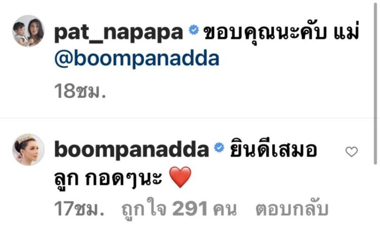 พร้อมกล่าวขอบคุณและแท็กถึงนักแสดงรุ่นพี่ว่า “ขอบคุณนะคับ แม่” ซึ่งทางด้าน บุ๋ม ปนัดดา ก็ได้เข้ามาคอมเมนต์ตอบกลับว่า “ยินดีเสมอลูก กอดๆนะ” สำหรับรายละเอียดนั้น แพทได้เผยกับทาง “ไนน์เอ็นเตอร์เทน” ว่า