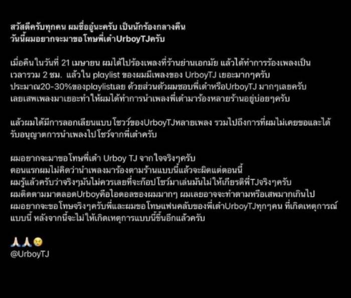 ล่าสุด นักร้องคนดังกล่าว ได้ออกมาโพสต์ข้อความขอโทษแล้ว “สวัสดีครับทุกคนผมชื่ออู๋นะครับ เป็นนักร้องกลางคืน วันนี้ผมอยากจะมาขอโทษพี่เต๋า UrboyTJ ครับ เมื่อคืน ในวันที่ 21 เมษายน ผมได้ไปร้องเพลงที่ร้านย่านเอกมัย แล้วได้ทำการร้องเพลงเป็น เวลารวม 2 ช.ม. แล้วใน playlist ของผมมีเพลงของ UrboyTJ เยอะมาก ๆ ครับ ประมาณ 20-30% ของ playlist เลย