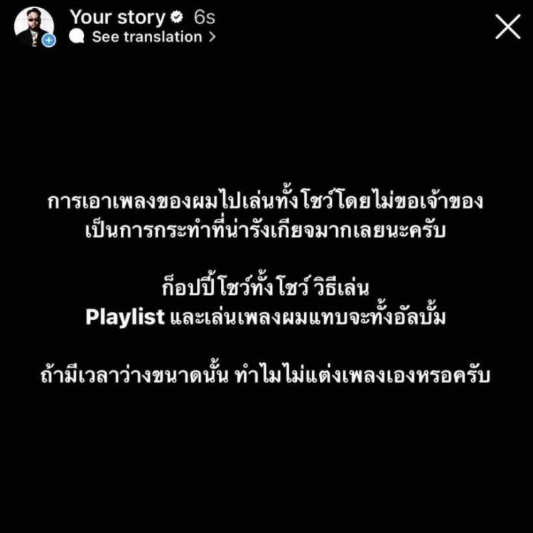 แต่ก็จะมีการขออนุญาตตามขั้นตอนเพราะ มีบริษัทที่ดูแลเรื่องลิขสิทธิ์และสิทธิทางปัญญาในผลงานของผมอยู่ การนำเพลงของผมไปเล่นหลายเพลงและลอกเลียนวิธีการโชว์ในแบบที่ผมและ วงใช้โชว์สดบนเวทีคอนเสิร์ตด้วยนั้น ผมว่ามันไม่สมควรเกิดขึ้นครับ หวังว่าจะเข้าใจในมุมการทำงานและผลงานของศิลปินนะครับ”