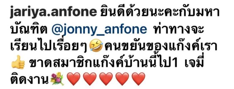 พร้อมข้อความว่า “ยินดีด้วยนะคะกับมหาบัณฑิต @jonny_anfone ท่าทางจะเรียนไปเรื่อยๆคนขยันของแก๊งค์เรา ขาดสมาชิกแก๊งค์บ้านนี้ไป1 เจมี่ ติดงาน”