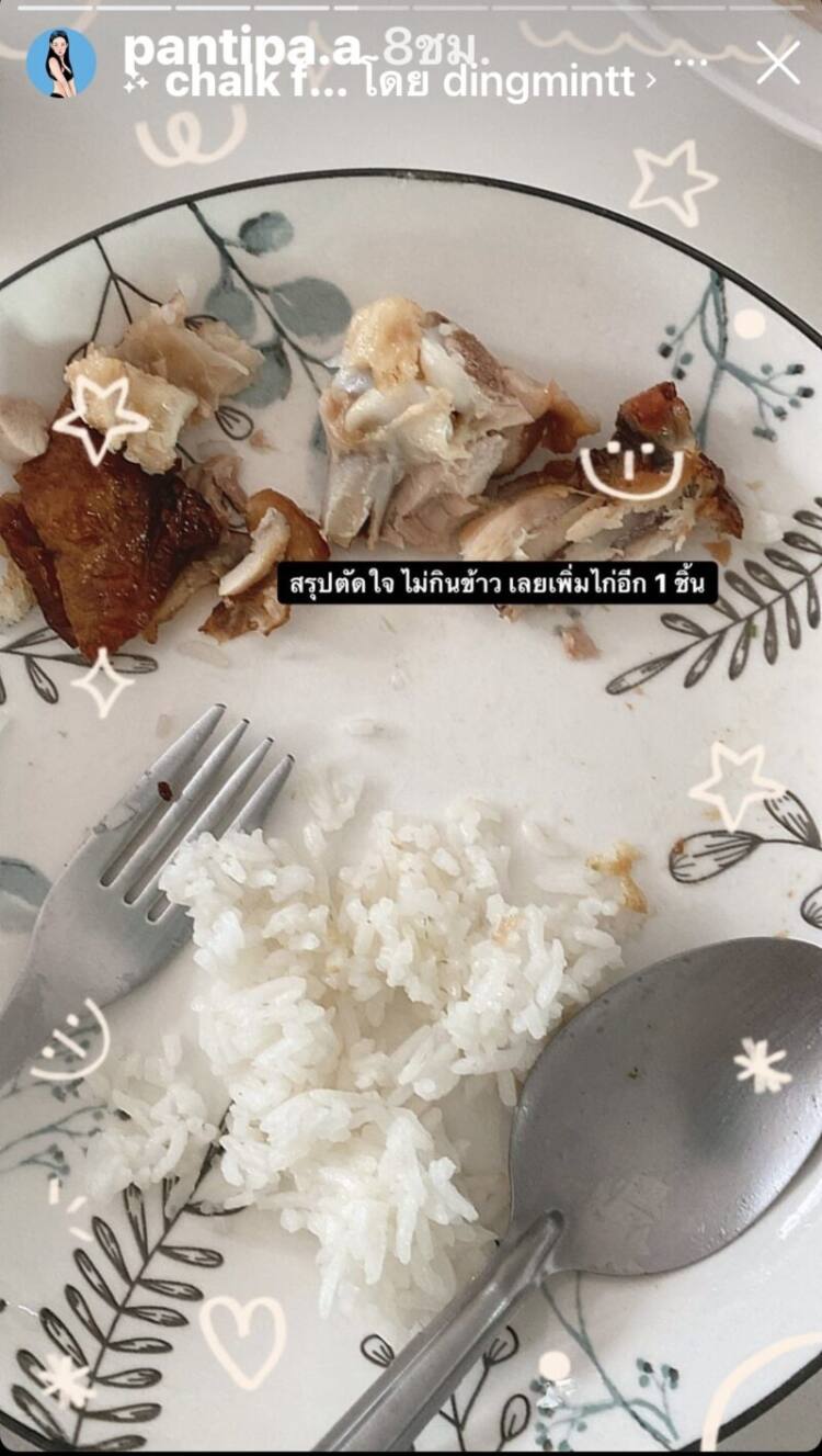“นี่คือข้าวเช้ารวมกับข้าวกลางวัน ข้าวประมาณ 2 คำ ที่เหลือเน้นกับข้าว กับข้าวมื้อนี้คือไก่ 1 ชิ้น ใช่ค่ะ เหมือนไหว้เจ้าที่” ก่อนจะโพสต์ต่ออีกว่า “สรุปตัดใจไม่กินข้าว เลยเพิ่มไก่อีก 1 ชิ้น”