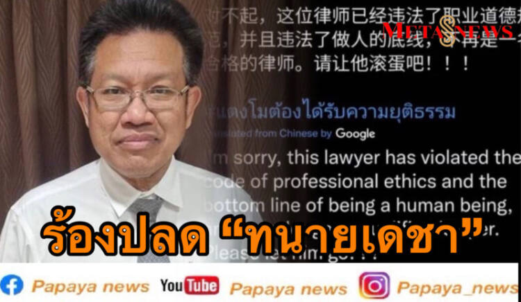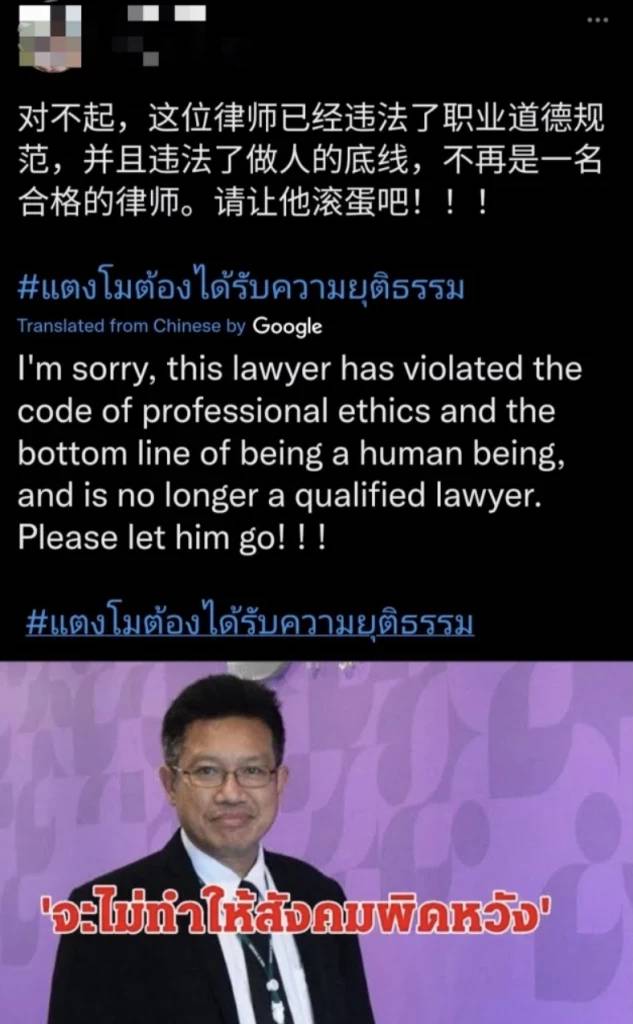 ล่าสุด มีชาวเน็ตจีนรายหนึ่งได้ออกมาโพสต์ข้อความถึงทนายเดชา ผู้ดูแลคดีแตงโม โดยแปลได้ประมาณว่า “ฉันขอโทษ แต่ทนายคนนี้ได้ทำลายจรรยาบรรณของวิชาชีพและขาดความเป็นมนุษย์อย่างรุนแรง ไม่เหมาะสมกับอาชีพนี้อีกต่อไป ได้โปรดปลดเขาออกไป” ทำเอาหลายคนจับตาว่า ทนายเดชาจะมีการเคลื่อนไหวหรือไม่