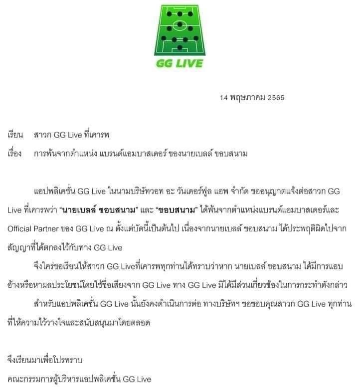 “แอปพลิเคชั่น GG Live ในนามบริษัทวอท อะ วันเดอร์ฟูล แอพ จำกัด ขออนุญาตแจ้งต่อสาวก GG Live ที่เคารพว่า “นายเบลล์ ขอบสนาม” และ “ขอบสนาม” ได้พ้นจากตำแหน่งแบรนด์แอมบาสเดอร์และ Official Partner ของ GG Live ณ ตั้งแต่บัดนี้เป็นต้นไป เนื่องจากนายเบลล์ ขอบสนาม ได้ประพฤติผิดไปจากสัญญาที่ได้ตกลงไว้กับทาง GG Live จึงใคร่ขอเรียนให้สาวก GG Liveที่เคารพทุกท่านได้ทราบว่าหาก นายเบลล์ ขอบสนาม ได้มีการแอบอ้างหรือหาผลประโยชน์โดยใช้ชื่อเสียงจาก GG Live ทาง GG Live มิได้มีส่วนเกี่ยวข้องในการกระทำดังกล่าว