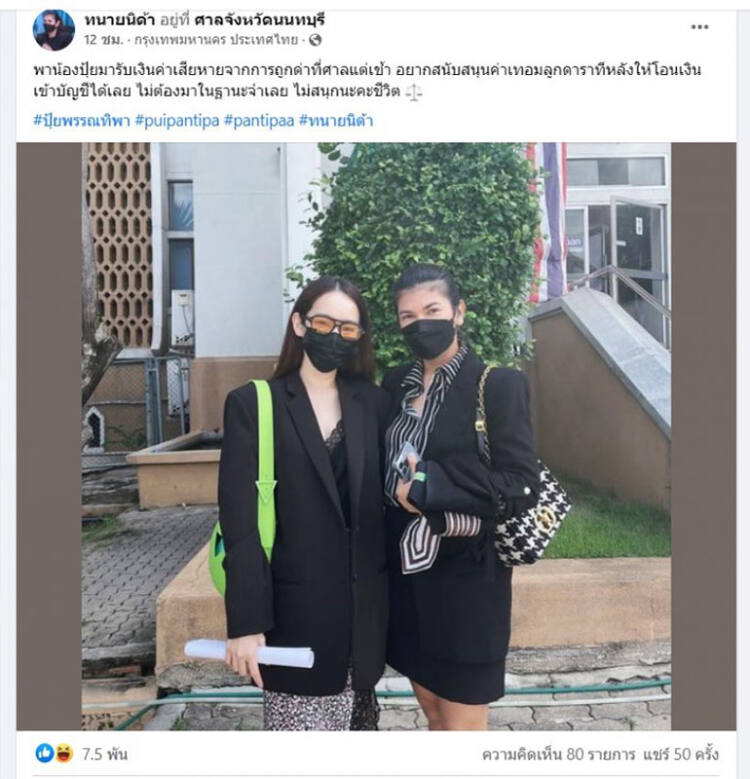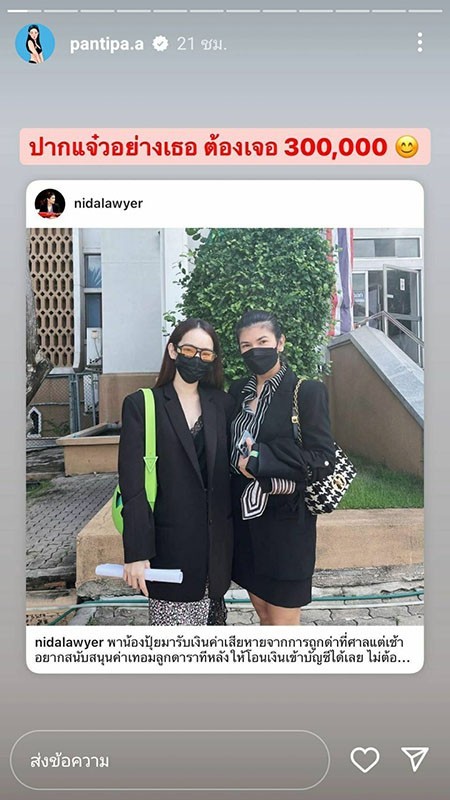 รับคำขอโทษเป็นเงินสดของจริง!! ดาราไม่ใช่ถังขยะอีกต่อไป ก่อนเมนต์ใครต้องเช็กเงินในบัญชี ล่าสุด “ทนายนิด้า” ทนายของ “ปุ้มปุ้ย พรรณทิพา” เมีย “กวินท์ ดูวาล” ได้เผยภาพพาสาวปุ้มปุ้ยไปรับค่าเสียหายจากคู่กรณีที่ศาลจังหวัดนนทบุรี หลังคอมเมนต์เจ้าตัวเรื่องที่ไม่ยอมเผยหน้าลูกแรงมาก งานนี้แม่ปุ้มปุ้ยไม่ทน จัดหนักจัดเต็ม ไม่รับกระเช้า ไม่เอาคำขอโทษ แต่ขอเป็นค่าเทอมลูกเท่านั้น ซึ่งเจ้าตัวได้เผยจำนวนเงินที่เชือดคู่กรณีว่า “ปากแจ๋วอย่างเธอ ต้องเจอ 3 แสน” ไม่มีเงิน อย่าเมนต์แรง โดนเรียกค่าเสียหายเดี๋ยวจะเป็นลม !