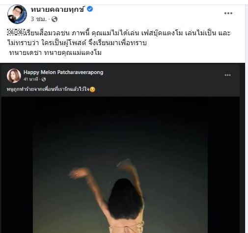 กลายเป็นประเด็นดราม่า หลังจากที่ เฟซบุ๊ก นางเอกผู้ล่วงลับ “แตงโม นิดา พัชรวีระพงษ์” โพสต์ภาพ “กระติก อิจศรินทร์” พร้อมข้อความ “หนูถูกทำร้ายจากเพื่อนที่เรารักและไว้ใจ” ว่าใครเป็นคนโพสต์ข้อความนี้ ล่าสุด ฝั่ง ทนายเดชา กิตติวิทยานันท์ ทนาย “แม่ภนิดา” แม่ “แตงโม” ก็ได้เผยผ่านเฟซบุ๊กทนายความทุกข์ว่า “เรียนสื่อมวลชน ภาพนี้ คุณแม่ไม่ได้เล่นเฟซบุ๊กแตงโม เล่นไม่เป็น และไม่ทราบว่าใครเป็นผู้โพสต์ จึงเรียนมาเพื่อทราบ ทนายเดชา ทนายคุณแม่แตงโม” พร้อมข้อความ “ผู้ที่เข้าไป แก้ไขเปลี่ยนแปลง ข้อมูลคอมพิวเตอร์ของผู้อื่นโดยมิชอบ มีความผิดตามกฎหมายคอมพิวเตอร์มาตรา 9 มีโทษจำคุกไม่เกิน 5 ปีหรือปรับไม่เกินหนึ่งแสน บาทหรือทั้งจำทั้งปรับ #เฟสแตงโม”
