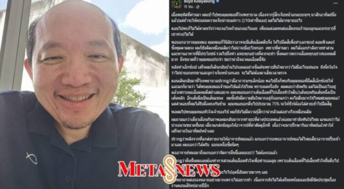“เมื่อพฤหัสที่ผ่านมา ผมเข้าไปพบคุณหมอที่โรงพยาบาล เนื่องจากรู้สึกเจ็บหน้าอกแบบจุกๆ มาสักอาทิตย์นึงแล้ว(แต่ถ้าจะให้คะแนนความเจ็บน่าจะแค่ราว 2/10เท่านั้นเอง) แต่ไม่ได้มากมายอะไร ตอนไปพบก็ไม่ได้คาดหวังว่าจะเจอโรคร้ายแรงอะไรเลย เพียงแต่อดทนต่อเสียงรบเร้าของลูกและภรรยา(ที่เขาห่วง)ไม่ได้