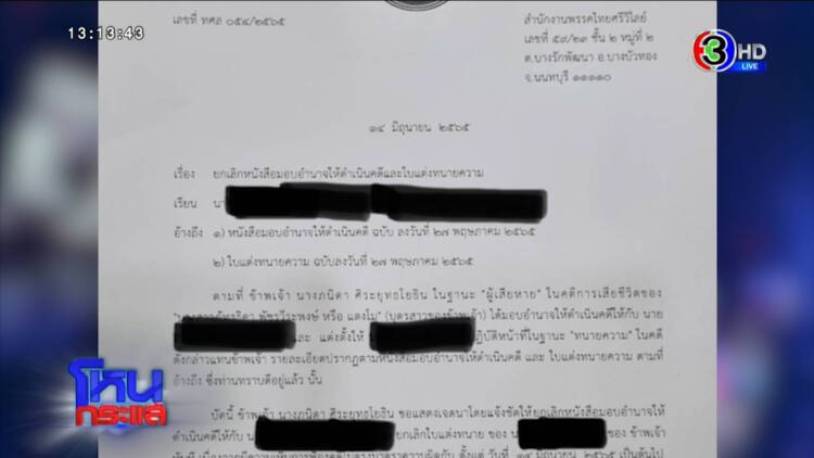 อัจฉริยะ : ผมได้รับมอบอำนาจ วันที่ 27 พ.ค. 2565 อยากให้เปิดภาพตอนแม่เซ็นหนังสือมอบอำนาจให้ผมหน่อย วันนั้นผมเปิดหลักฐานให้แม่ดูครั้งแรกเลยที่เป็นภาพที่มีคราบเลือดต่างๆ แม่เห็นแล้ว แกก็เข้าใจแหละว่าเป็นฆาตกรรม แกถึงได้เซ็นหนังสือมอบอำนาจ ให้ผมกับน้องอีกคนนึง แล้วก็ตั้งทนายให้ไปฟ้องคดีฆาตกรรม ไม่มีการบังคับขู่เข็น เซ็นด้วยความเต็มใจ จากนั้นเราก็มีการไปเจอแกที่คอนโดครั้งนึง ก็เอาหลักฐานให้แกดู แกก็เชื่อว่าเป็นฆาตกรรม แล้วก็ไปที่กองกำกับการตร.ไซเบอร์พูดคุยเรื่องคดี แกก็โอเค ไม่มีปัญหากัน ต่อมาผมก็มีการร่างคำฟ้องเสร็จสิ้น แต่ไม่ได้เปิดให้ใครดู เพราะไม่ไว้ใจใคร ทุกอย่างเป็นเงิน ถ้าข้อมูลรั่วคือเป็นเงินเป็นทอง คดีนี้เราเดิมพันสูงแล้วก็สู้กับคนรวยและอำนาจรัฐที่ไม่เป็นธรรม ผมก็พาทุกคนไปที่เซฟเฮ้าส์ วันนั้นเว้นคุณแม่คนเดียว