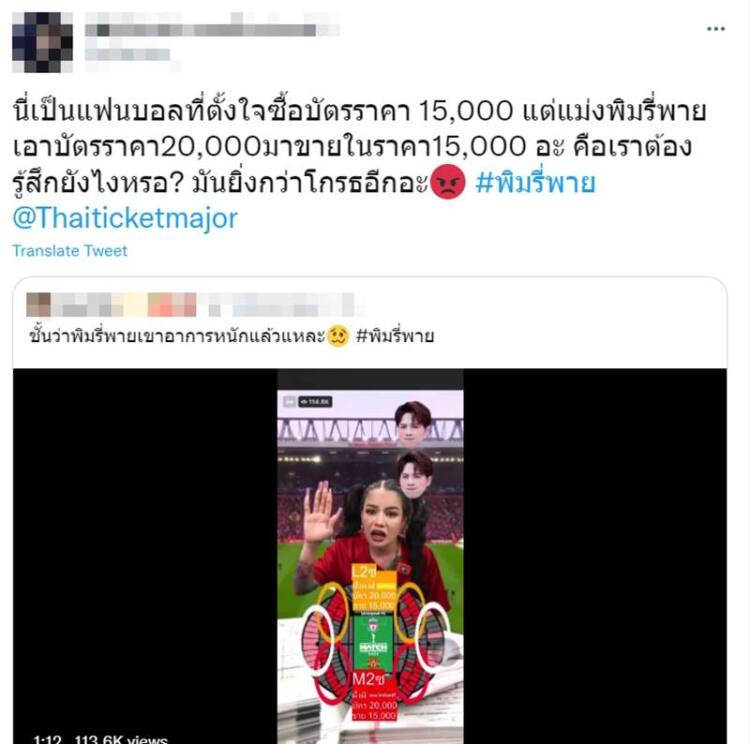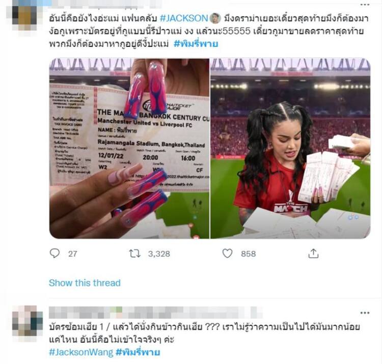 ทำอะไรก็เดือดจนขึ้นเทรนด์ทวิตเตอร์ตลอด สำหรับ “พิมรี่พาย” แม่ค้าออนไลน์สุดฮอต ล่าสุดไลฟ์ขายบัตรศึกแดงเดือด “THE MATCH Bangkok Century Cup 2022” ระหว่าง ลิเวอร์พูล กับ แมนเชสเตอร์ ยูไนเต็ด ที่สนามราชมังคลากีฬาสถาน ในวันที่ 12 ก.ค. 2565 ซึ่งจะมีโชว์เปิดสนามจากศิลปินชื่อดัง “แจ็คสัน หวัง” ซึ่งลดราคาบัตรกว่า 2 หมื่นใบ พร้อมแจกบัตรรับชมการซ้อมคอนเสิร์ต งานนี้ทัวร์ลงยับว่าเจ้าตัวได้บัตรมาจากไหนเป็นจำนวนมาก เพราะสิทธิในการสั่งซื้อนั้นจำกัด 1 คน ซื้อได้เพียง 4 ใบ อีกทั้งผู้ที่ซื้อบัตรจากพิมรี่พาย สามารถสุ่มสิทธิรับประทานอาหารกับแจ็คสันฟรีอีกด้วย
