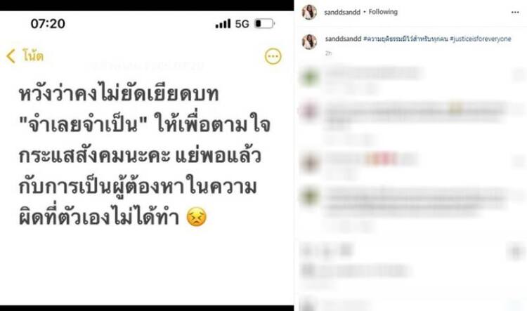 “หวังว่าคงไม่ยัดเยียดบท จำเลยจำเป็น ให้เพื่อตามใจกระแสสังคมนะคะ แย่พอแล้ว กับการเป็นผู้ต้องหาในความผิดที่ตัวเองไม่ได้ทำ” พร้อมกับมีแคปชั่นระบุต่อว่า “#ความยุติธรรมมีไว้สำหรับทุกคน #justiceisforeveryone”