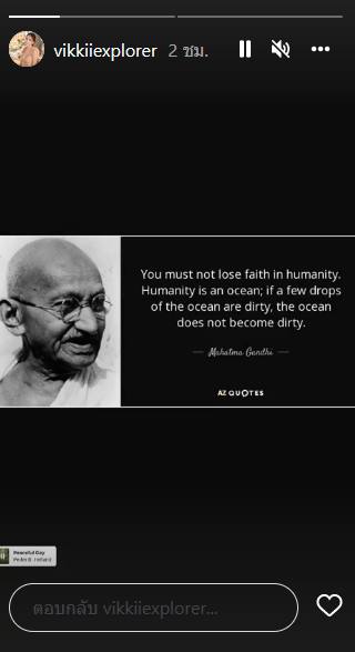 โดยสาววิกกี้โพสต์คำคมของมหาตมะ คานธี ผ่านทางไอจีสตอรี่ว่า “You must not lose faith in humanity. Humanity is like an ocean; if a few drops of the ocean are dirty, the ocean does not become dirty” ทำนองว่า “คุณต้องไม่สูญเสียศรัทธาในความเป็นมนุษย์ มนุษยชาติเป็นเหมือนมหาสมุทร หากมหาสมุทรสกปรกเพียงไม่กี่หยด มหาสมุทรก็ไม่สกปรกอยู่ดี”