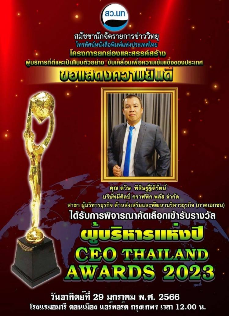 คุณดวิษ พิสิษฐ์ฐิติรัตน์ ผู้บริหาร บริษัท มีศิลป์ กราฟฟิก พลัส จำกัด นำทัพรับรางวัล CEO THAILAND AWARDS 2023