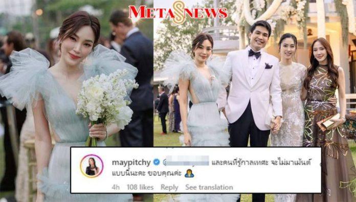วันดีๆ ก็มีอันสะดุด หลังจากที่อินสตาแกรม “เมย์ พิชญ์นาฎ สาขากร” ถูกชาวเน็ตรายหนึ่งเข้ามาเมนต์ใต้ภาพที่ไปร่วมแสดงความยินดีในงานฉลองวิวาห์ของ “ปอย ตรีชฎา – โอ๊ค บรรลุ หงษ์หยก” โดยอีกฝ่ายเมนต์เหน็บว่า “คุณอั้มสวยมากกกค่ะ แต่งตัวรู้กาละเทสะ ไม่แย่งซีนเจ้าสาว” รวมทั้งมีคนเข้ามาเห็นด้วย ทำนองว่า “จริงค่ะ จะมาบอกจัดเต็มแค่ไหนเราก็ควรดูด้วยว่าเราคือแขก วันนั้นต้องให้เจ้าสาวคนเดียวเท่านั้น”